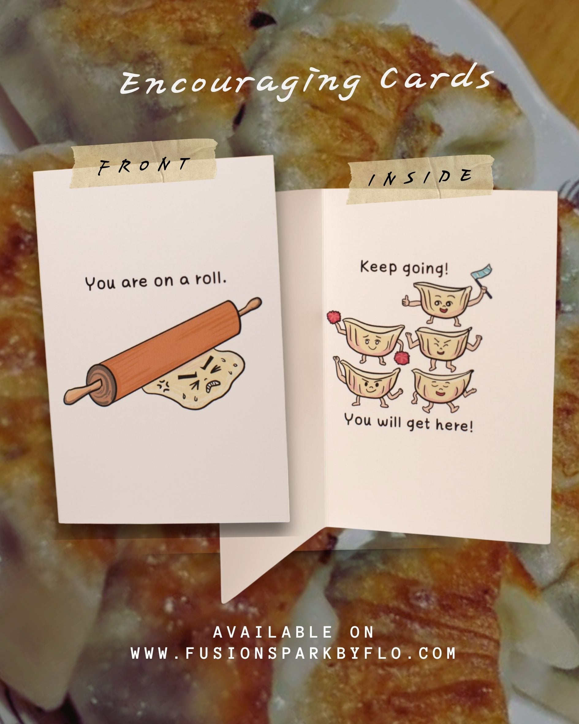 Spread some motivation and humor with our 4" x 6" Encouraging Greeting Card: "You are on a roll". Made from a dough, the little dumplings inside will surely bring a smile to the recipient's face!